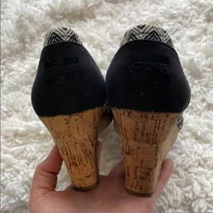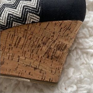 These espadrilles are the wedge style. Black and white pattern. Back left heel has a little wear, not incredibly noticeable. Otherwise, excellent used condition. Size 9.5.