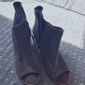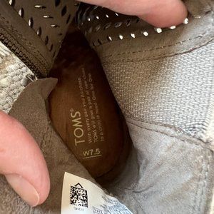 Excellent pair of Toms Majorca laser cut booties in tan suede. Side zipper, peep toe, 3.5” stacked wood heel. Light signs of wear