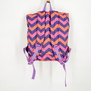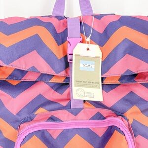 Stylish Toms backpack with a vibrant chevron pattern. Features a front pocket and adjustable straps. Perfect for everyday use.