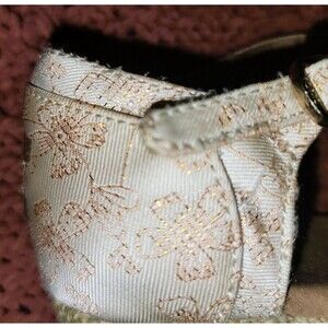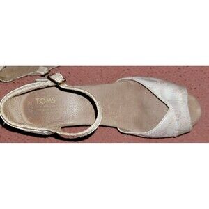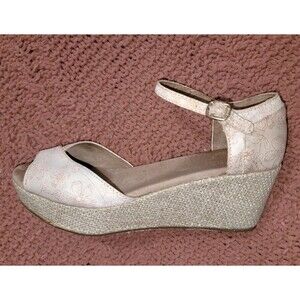Toms swag raffia covered wedge platform sandals with a slender adjustable buckle & vamp in satiny cream & rose gold colored Jacquard with rose gold floral embroidered stitching. Toms cream ivory wedge heels in size 7.5.