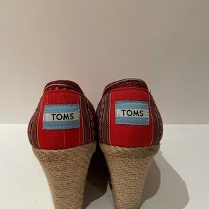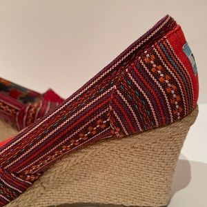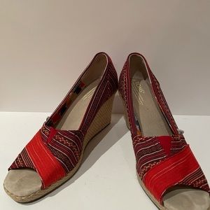 Toms Red Pattern Wedges. Size 7.5. Excellent condition. Such a pretty pattern! Clean shoe. Heel height is 3 and 1/4 inches.