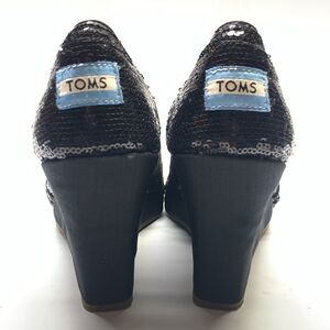 Toms Shoe Womens 10 Black Sequin Wedge Open Toe Slip On Sandals. Logo on back heel. Heel height 3". Very good clean condition.