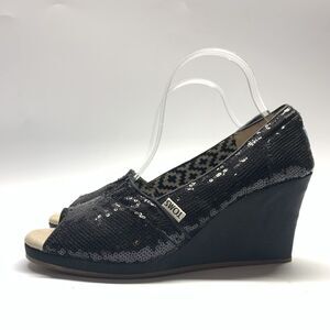 Toms Shoe Womens 10 Black Sequin Wedge Open Toe Slip On Sandals