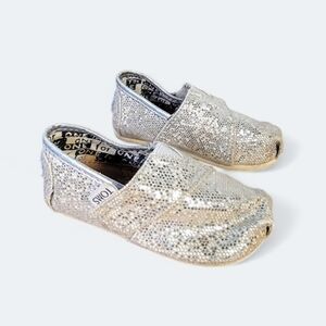 Silver metallic glitter slip on flats /loafers shoes. One hook and loop closure.