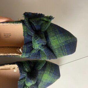 Tom's Size 9.5 Alpargata Leather Wrap Green Plaid Bow Slip On Shoes Fall Festive