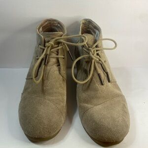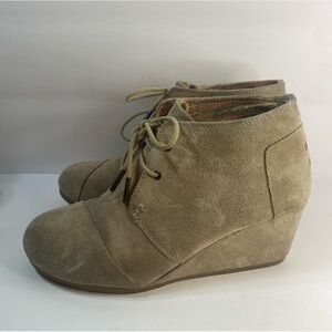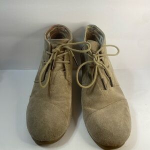 Stylish suede Tom’s booties with a lace-up design. Features a comfortable wedge heel. They are casual and neutral color so they go with everything while giving you a bit of height.