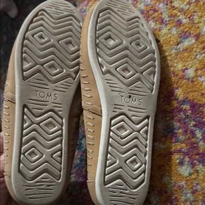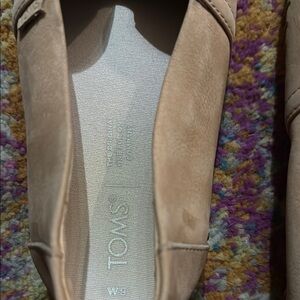 These Toms flats feature a light tan suede-like material that offers a soft and textured look. Designed for comfort, they have a rounded toe and a wide elastic opening for easy wear. The flat sole provides flexibility, making them perfect for everyday use.