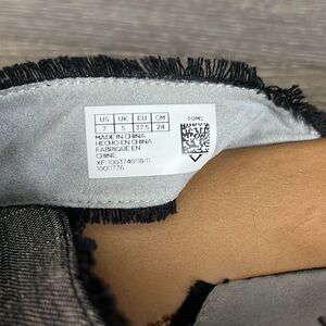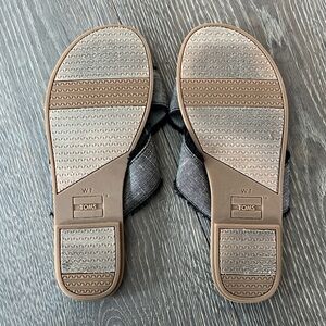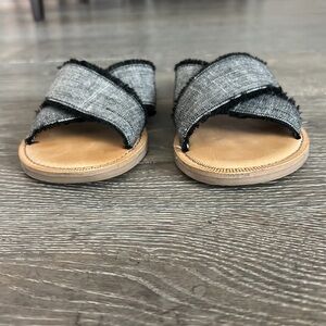 Toms womens Viv sandals size 7W in black. Casual flat slip on sandals. Crisscross straps. Cushioned insole for all day comfort. Black chambray textile upper with fringe detail. Excellent condition. Worn once. Only wear is on soles. Smoke free home. Fast shipping.