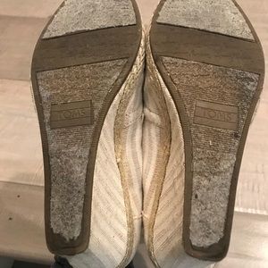 Toms open toe wedges in beige and white stripes. 3 inch heels. Worn only few times and in great condition. Size 5.