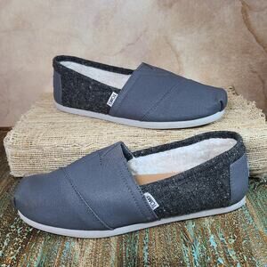 TOMS women’s size 9M canvas flats with sherpa lining. Soft gray slip-ons with cozy fleece interior, perfect for casual wear, travel, or layering in cooler months. Lightweight and flexible with a comfort fit.