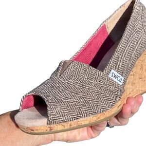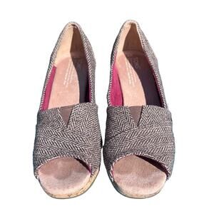 Tom’s Women’s Brown & Tan Herringbone Peep-Toe Cork Wedges Size 7