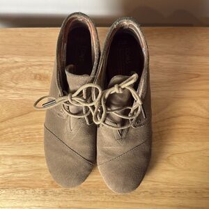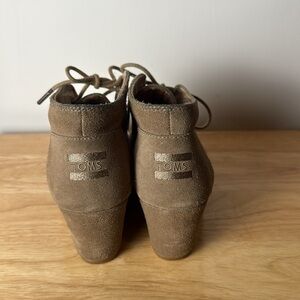 TOMS, women's ankle booties, desert wedge, tan beige, suede boots, lace-up booties, size 8.5, wedge heel, casual boots, comfortable footwear, stylish booties, everyday fashion, fall and winter shoes