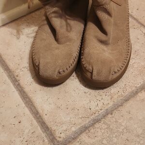 Tan suede exterior with tan faux shearling inner lining.