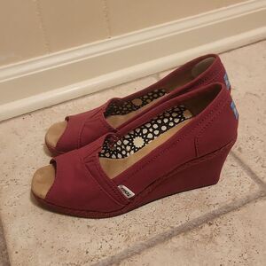 Toms Women's Pink Canvas Heeled Wedge Open Peeptoe Sandals Size 8.5