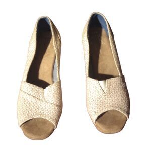 Toms cream colored wedges. Women's size 7.5. In gently used condition, no scuff's or tears. See photos for material & measurements.
