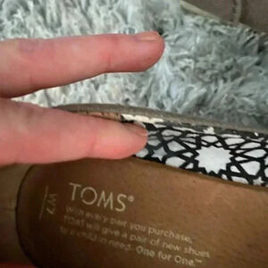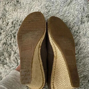 Size 7 Toms gray wedges with open toe. Has espadrille heel style and gray upper. Has some wear on the toes but overall Excellent used condition