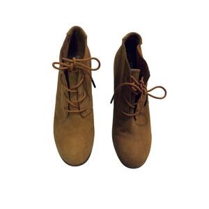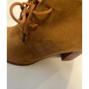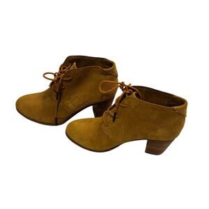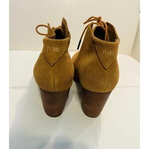 Toms camel colored or tan suede booties. Block heels. Overall in excelled condition but one markup on suede as pictured.