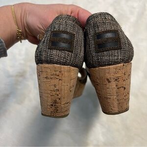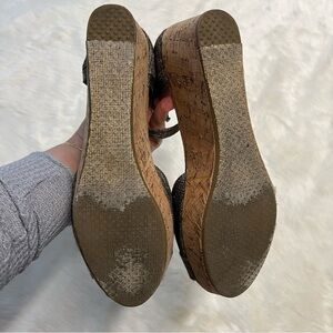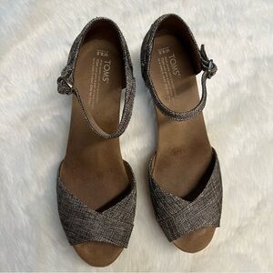 Great wedge sandals from Toms- slight gold hue to the fabric. Cushioned sole. Back wedge height 2.75” and front 1”.