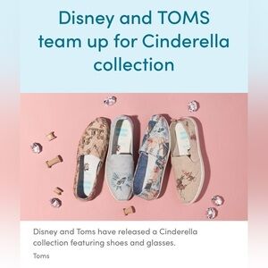 New without tags - never worn! Toms x Disney collaboration “Cinderella” theme classic printed canvas slip-on shoes. Women’s size 9.5. Please see all photos as part of description. Smoke-free home!