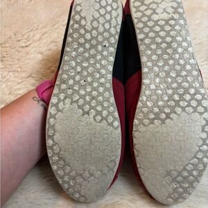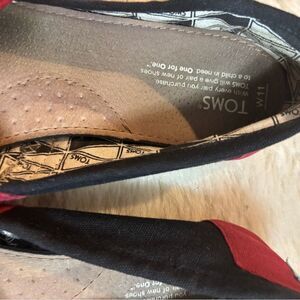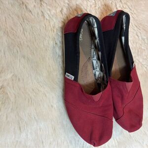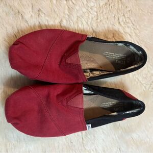 Comfortable Toms slip-ons in red and black. Perfect for casual wear.