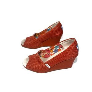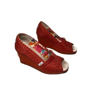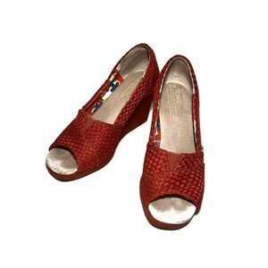Red woven Tom’s wedges. Lightly padded insole, rubber sole. Material on heels is lifting away a little in a couple spots, but tons of life left in these shoes