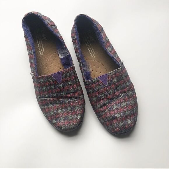 Purple and pink glitter slip on atoms. Lined with purple “fur”. Good used condition with minimal wear on the bottoms and some piling on the inner lining. Size youth 5