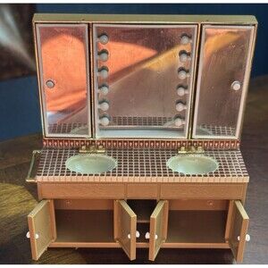 The Tomy Better Smaller Homes Dollhouse Furniture Bathroom Dual Sink Vanity is a miniature vanity set designed for dollhouse bathrooms. Made by TOMY, this set includes a vanity, sink, and mirror, providing realistic details for a dollhouse bathroom. Perfect for decorating and accessorizing a small space, this dual sink vanity adds charm and functionality to the dollhouse environment. Ideal for children who enjoy imaginative play and dollhouse activities, this product enhances the play experience with its attention to detail and quality construction. Measures 5X4.5X1.5.