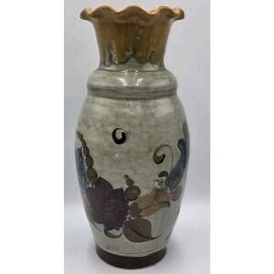 Tonala Bud Vase Handpainted Mexican Folk Art Pottery Bluebird Redbird 11"