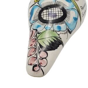 Wonderful, folk art bird figurine from Mexico. It has an off-white ground, hand painted floral design in yellow, turquoise blue, green, black, and plum accents.