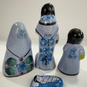 Tonala Mexican Pottery Nativity Blue 4 Piece Set Christmas Holy Family