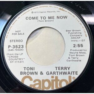 A 45 RPM vinyl promotional record featuring "Come To Me Now" by Toni Brown & Terry Garthwaite. Includes mono and stereo versions. Released in 1973.