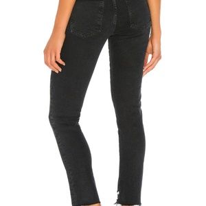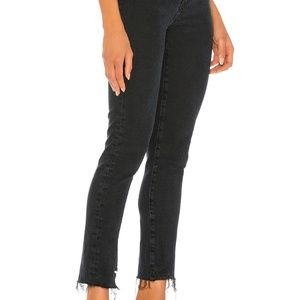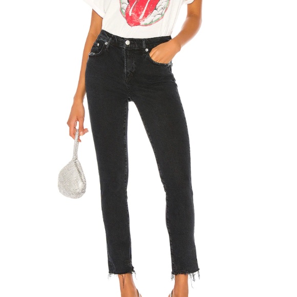 66% lyocell, 32% organic cotton, 2% elastane. Light fading and distressed detail. Zip fly with button closure. 5-pocket design. Raw cut frayed hem. 13" at the knee narrows to 11" at the leg opening. Made in Turkey. Revolve Style No. AGOL-WJ215. Manufacturer Style No. A133D 3002.