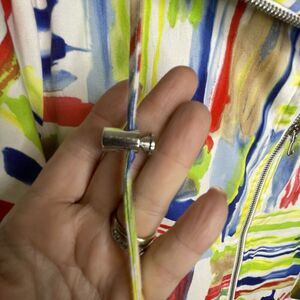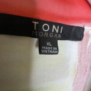 The Toni Morgan Art To Wear Jacket in size XL features a modern and abstract design with full pockets and a zip closure and tie closure for collar. Made of a lightweight cotton spandex blend with a stretch fabric, this zippered jacket is perfect for casual occasions in the summer, fall, and spring seasons. The colorful pattern and bright colorful paint brush strokes theme add a fun and vibrant touch to the mid-length jacket, making it a stylish and comfortable choice for women looking to express their unique style.