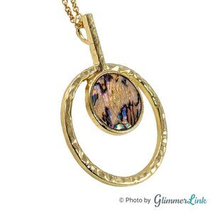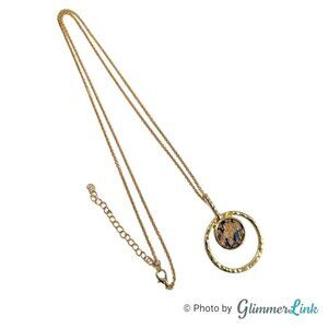 Toni gold tone chain necklace featuring round circle within circle hammered pendant accented with mother of pearl shell.