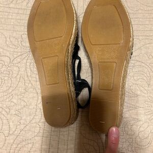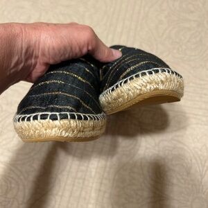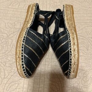 Great condition. Look brand new. Soft textile lining and footbed midsole made from 100% cotton.outsole made from 100% jute. Made in Spain. Black with gold and silver stripes Size 8.5