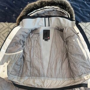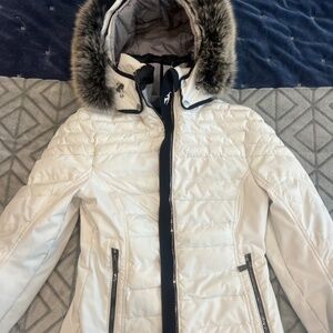 Beautiful white insulated puffer ski jacket, real fur, very soft. Hood and fur can be de-attached when desire.