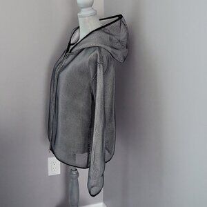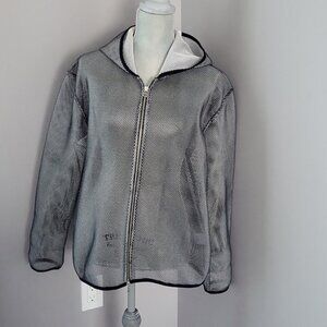 Stay cool and comfortable in this mesh style hooded zipup jacket, designed for both performance and style. Crafted from breathable mesh fabric, this jacket is perfect for layering during workouts or casual outings. Black mesh has a metallic look with Tonia Debellis logo black trim and double zipper.