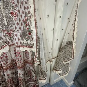 Beautiful floral embroidered Anarkali dress with matching scarf and Bottom from Pakistan. Features intricate patterns and delicate lace details. Size 24.