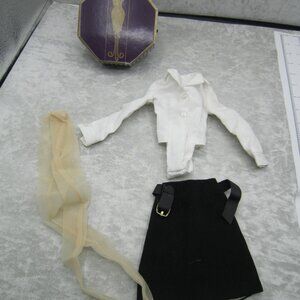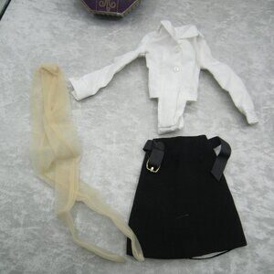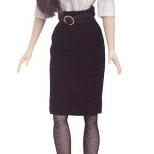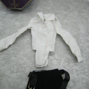 Tonner Tyler Wentworth's signature style outfit is a white blouse, black straight skirt, stockings, and signature hat box.