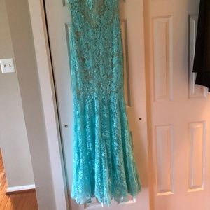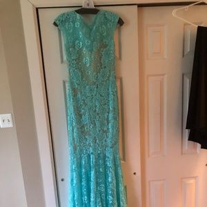 Elegant mermaid turquoise lace prom dress or evening gown. High neck. Size 2. Purchased from local boutique. Alterations are easily capable to take dress in/take it out. Could also be cut so as to make into a shorter dress to wear to a different event, such as homecoming. Truly my favorite dress. Incredibly comfortable and easy to move around in.