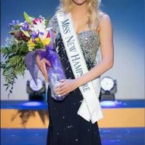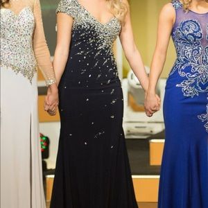 Custom Tony Bowls Navy Jersey with gorgeous stoning. Worn to win Miss NH as evening gown. Comfortable and looks stunning on stage. Daughter is 5’9 and wearing 5” heels. In excellent condition. Stunning.