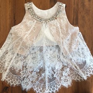 Excellent preowned condition, which the exception of a few very tiny spots (shown in pictures). Missing a few rhinestones (was missing when I purchased it new) but, not very noticeable. I do have a small bead pack that came with the dress.
