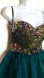 Beautiful strapless vibrant, multi-colored design reminiscent of a peacock, fitted bodice heavily embellished with a variety of colorful, iridescent beads or sequins, creating a mosaic-like effect. The skirt is short, voluminous, and made of layered tulle or similar sheer fabric in shades of blue, green, and black, creating a flowing, ethereal look.