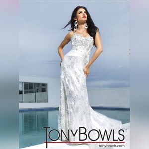 Beautiful size 2 Tony Bowls Prom / Pageant dress was worn once so has some minimal wear and one jewel is hanging off, but honestly it’s hard to even notice and could be easily sewn back on.