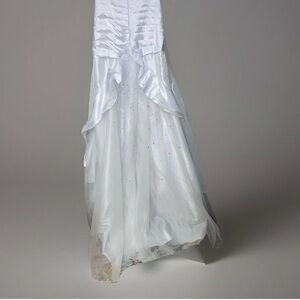 Simply stunning dress with one shoulder style dress with v neckline chest area is accented with beading and sequins. Waist area is encrusted with gorgeous beads and sequins on an under bodice band. Side gathering, accented by a matching beaded band. Inner bra so no need to wear one. Gathered full skirt, fully lined, with tulle, and under satiny skirt for comfort. The back features a train that can be hooked up along with a flowing colored train that snaps.