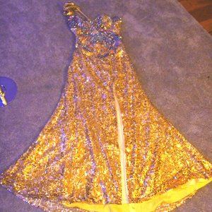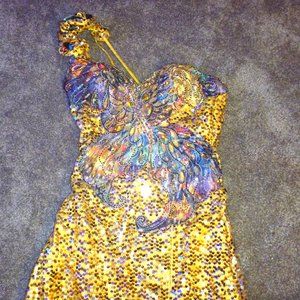 Welcome! Yet another incredibly beautiful size 8 prom dress by Tony Bowls, up for sale is yellow-gold long dress that has a blue butterfly theme for the torso! It is in excellent, unworn condition, but it has been stored for several years and made need an ironing/dry clean. When I obtained this amazing dress, it actually fit me with no problem. The outbreak forced me to store it away until everything returned to normal, but my fitness pursuits over that course of time increased my body weight and mass to the point where I couldn't fit into it anymore! Since I may never be able to fit it now, I decided to take all of my stored clothing out and consolidate my closets with clothes that actually still fit me. Ugh, what a mess. Please make offers!