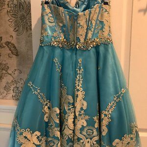 Look stunning in this baby blue and gold beaded short dress. This elegant dress has been worn twice. Strapless, comes with straps that can be attached. GREAT FOR HOMECOMING!