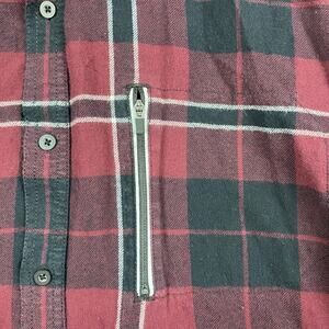 Men’s Tony Hawk plaid flannel shirt in red and black with thin white accents. Classic button-front design with collared neckline, button cuffs, and a unique zip chest pocket detail. Made from 100% cotton for comfort and durability.