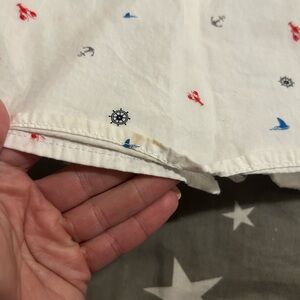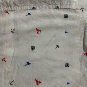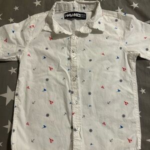 White button up with collar- tiny all over marine themed print with matching dark blue chino style shorts.