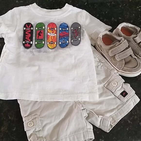 Gently worn, size 12 mo, cargo short/ t shirt set, (shoes sold separately)